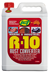R-10 is water based and non-toxic. It converts rust to a stable black surface of Iron Tannate/Haematite and Magnetite and forms a strong matrix bond with the original metal. The converted rust is then a stable, non-growing, hard, black material which can be safely cut, welded galvanised and chromed and behaves as steel would in these situations.
