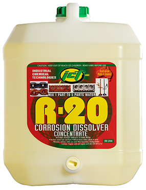 R-20 can be used as a bath with 1 part R-20 to 5 parts water (in Plastic Container) Simply place corroded parts in the bath for between 3-24 hours. The corrosion is dissolved revealing only the base metal, which can then be prepared for painting.
